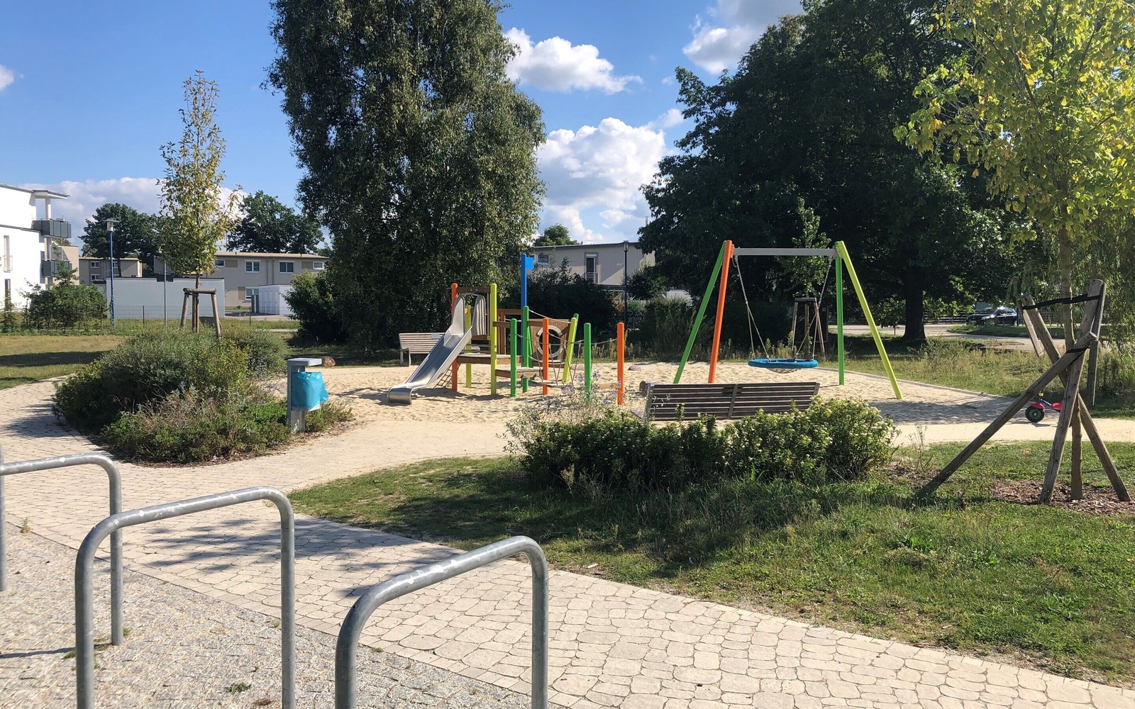 Zusätzlich ist eine Seilbahn mit hölzerner Startrampe vorhanden. Die gesamte Fläche ist durch gepflasterte Wege erschlossen, Sitzmöglichkeiten und Mülleimer sind vorhanden. Die Spielanlage ist umgeben von Bäumen und Sträuchern, die für ein schattiges Plätzchen und ein angenehmes Umfeld an heißen Tagen sorgen.