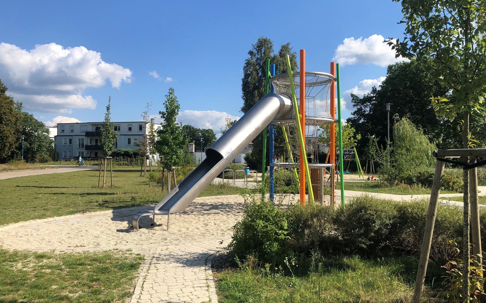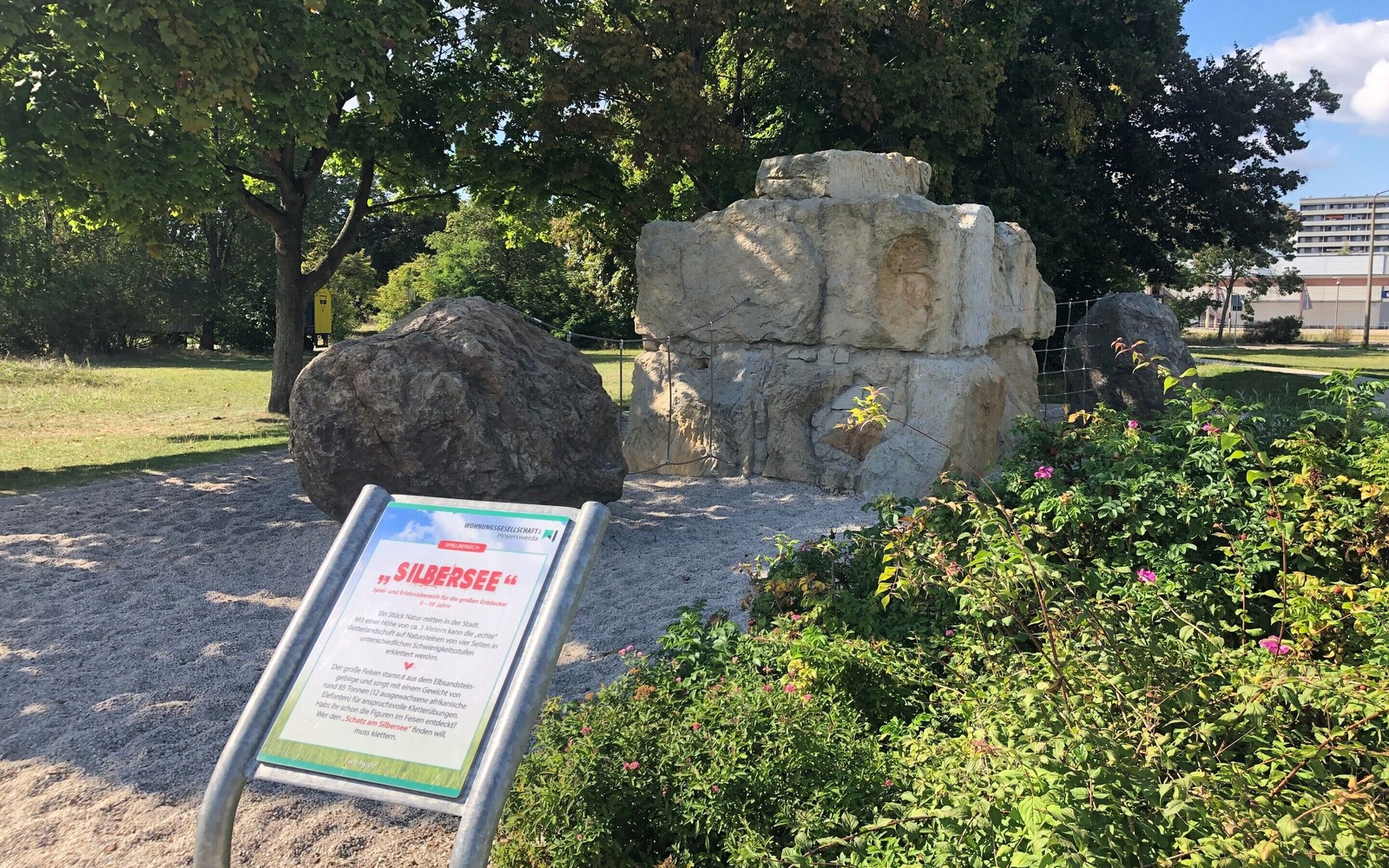 Ein weiterer Bereich ist durch einen Kletterturm mit einer langen, geschlossenen Röhrenrutsche geprägt. Der Turm ist über Netzelemente erreichbar und farblich ansprechend gestaltet. In Sichtweite dazu befindet sich ein kleiner Kletterfelsen mit mehreren großen Natursteinen und einer Infotafel mit dem Titel „Silbersee“, die auf ein spielerisches Thema hinweist.