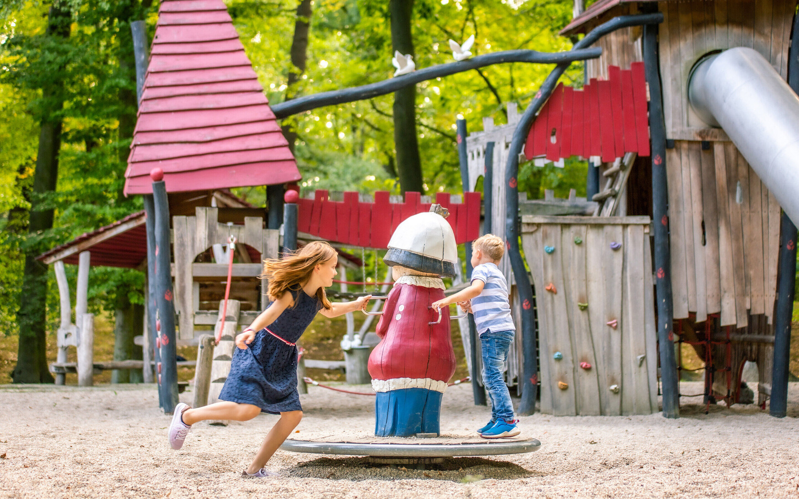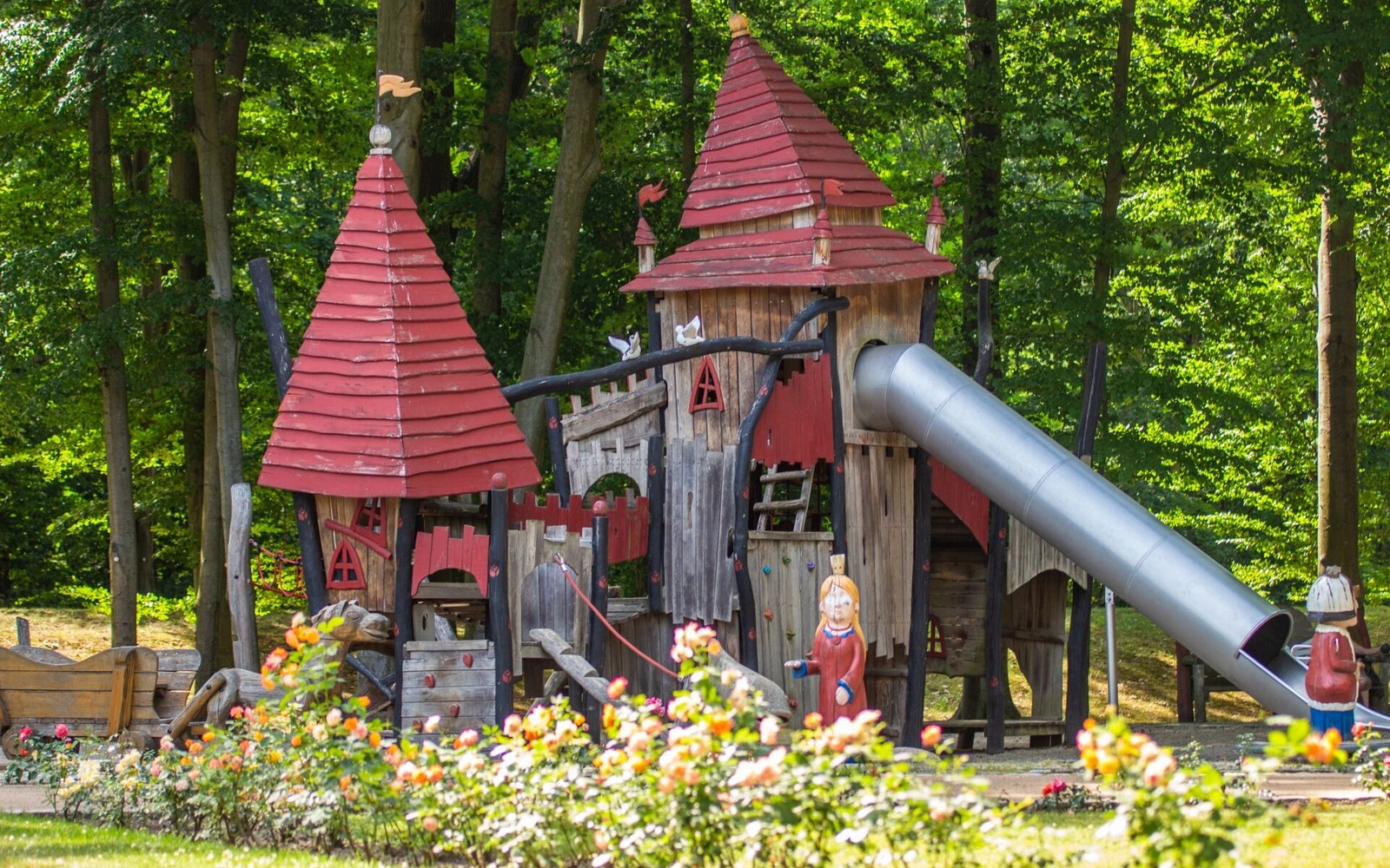 Ergänzt wird das Angebot durch zahlreiche thematisch passende Spielgeräte wie das Karussell „Schlafende Königin“, Wackelfiguren „König“ und „Küchenchef“, eine Federwippe in Pferdeform, ein Pferd mit Wagen, ein Kletterfelsen mit Spinnennetz sowie Balanciersteine, eine Drehscheibe und das „magische Fenster“ mit Prinz und Prinzessin.