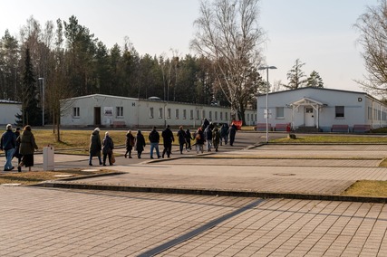 Gruppe auf dem Weg zur Ausstellungsbaracke (links) auf dem Gelände der Landesfeuerwehrschule, , Foto: Georg Vesper, Lizenz: Schloss & Stadtmuseum Hoyerswerda (Bild: 1/2)
