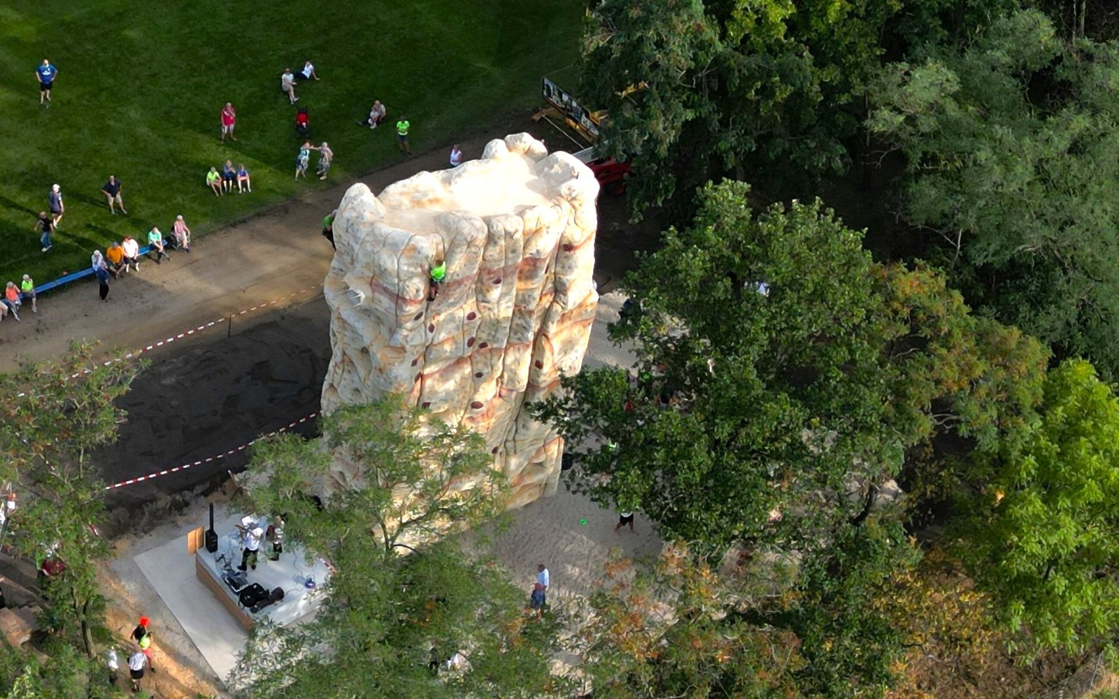 With a base area of 7.5 x 3.5 metres and a height of 13 metres, a total climbing area of approx. 400 m² was created. 161 safety hooks, 15 deflection points, a Saxon abseil ring and, of course, a summit book were installed. The spacious summit area invites you to linger and look around.